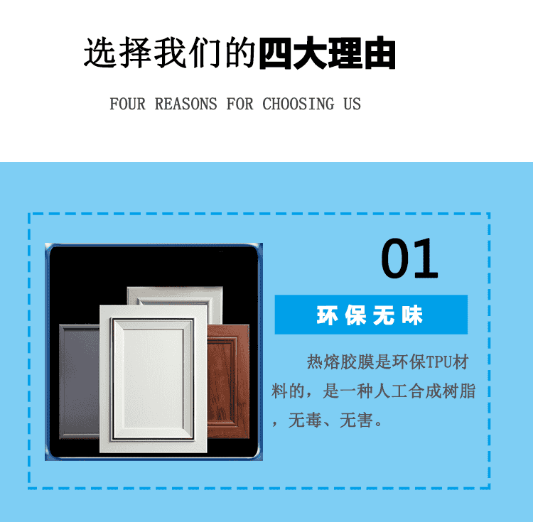 主要用于吸塑門、模壓門替代噴膠工藝,直接將膠膜貼合在PVC裝飾膜的背面,節省人工、提高質量的同時又能降低成本.